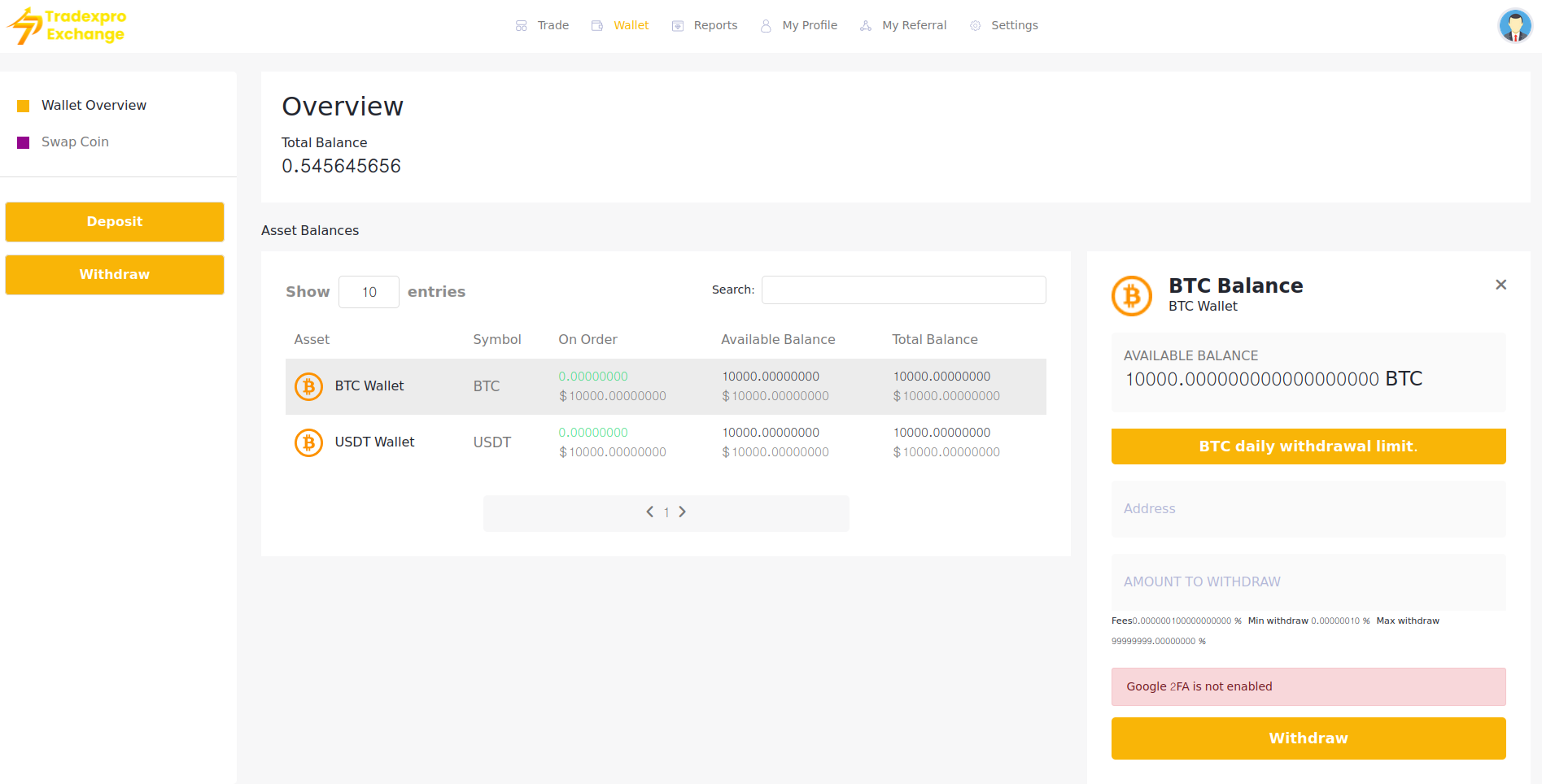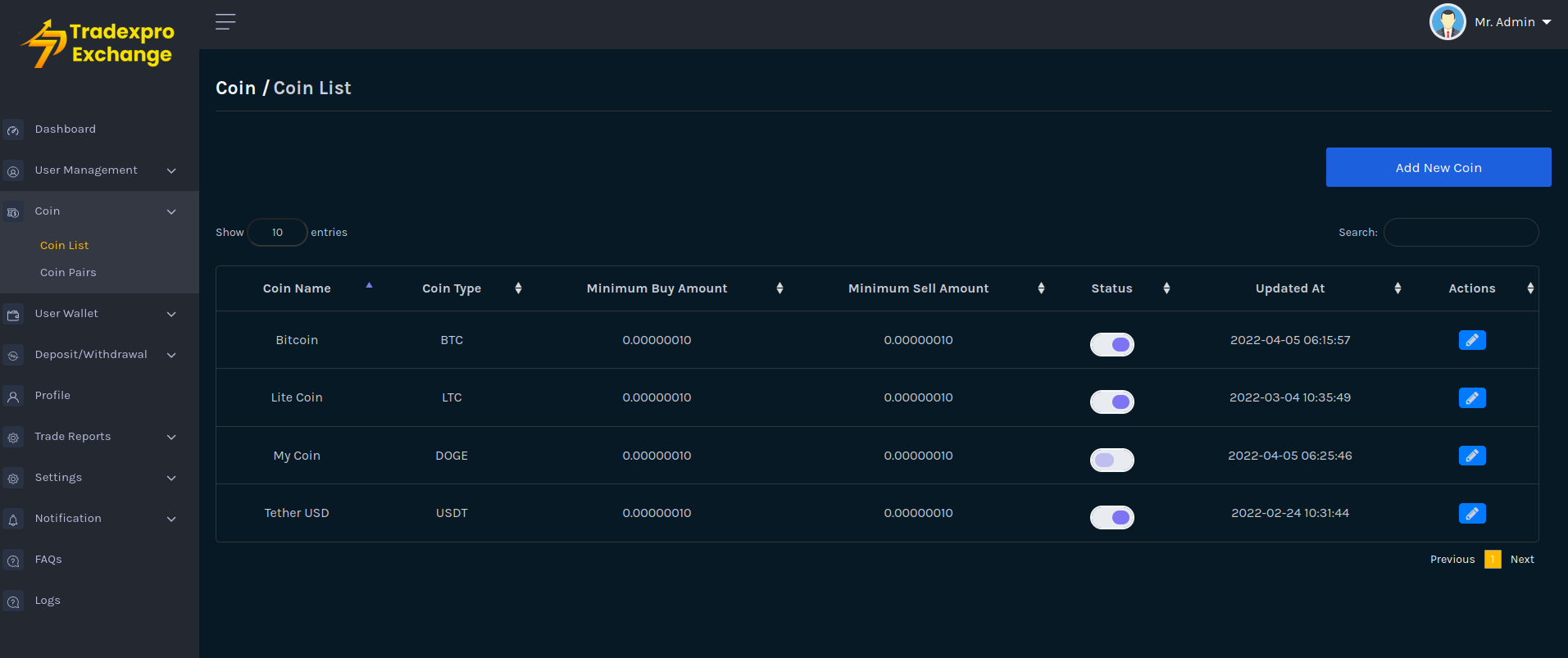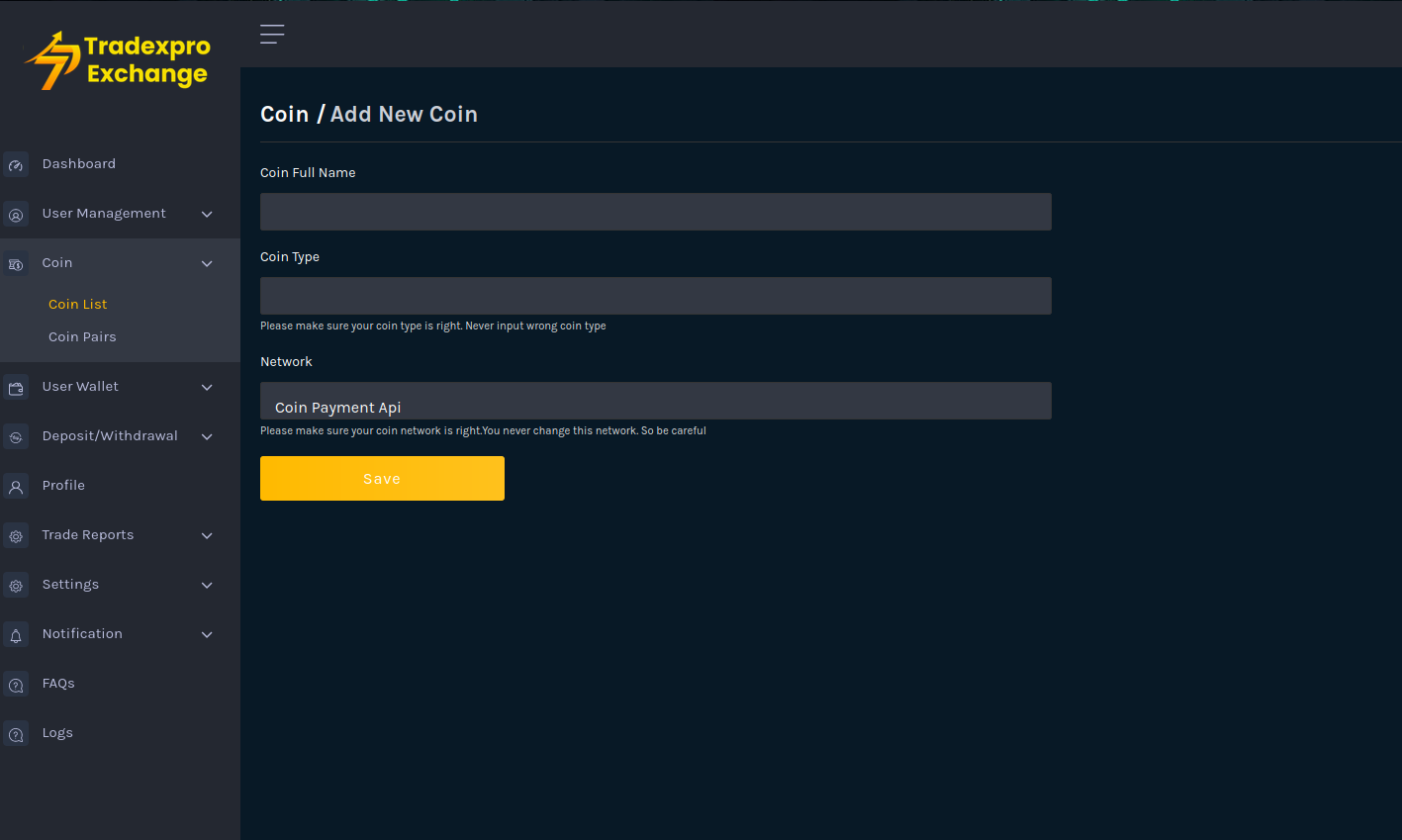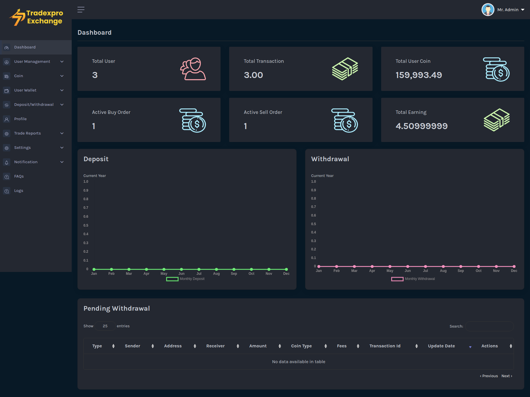 Tradexpro Exchange is a complete crypto coins exchange platform developed with Laravel and next js. It is the best choice to buy, sell or exchange any crypto coin that works via coin payment or bitcoin fork node. It will connect with a coin payment merchant account, or also connect with node. Our system is 100% secure and dynamic. It supports all cryptocurrency wallets including Coin Payment, Buy , Sell , Stop Limit, Deposit, Withdrawal, Referral system, and whatever you need. The most attractive feature of this platform is trading. In the trading system, you can place buy and sell orders according to your preferences of coin prices. Beside that, you can check your balance from wallet section. You can also check your buy-sell transaction status, deposit, withdrawal histories.
