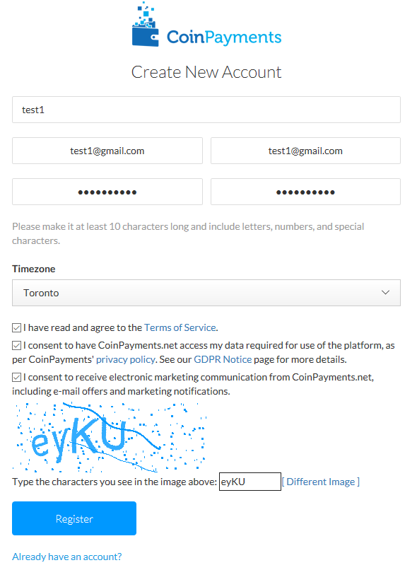 Sign up for a CoinPayments account here or click the Sign Up button in the top right corner of the CoinPayments website .