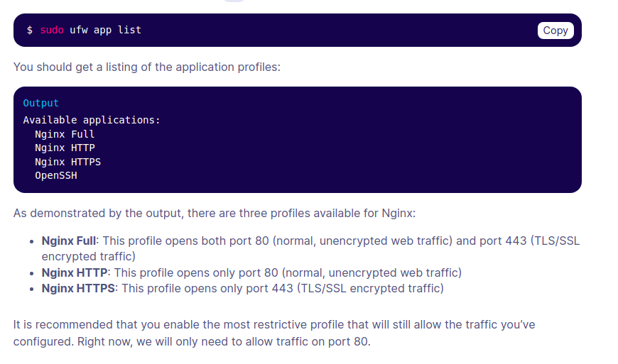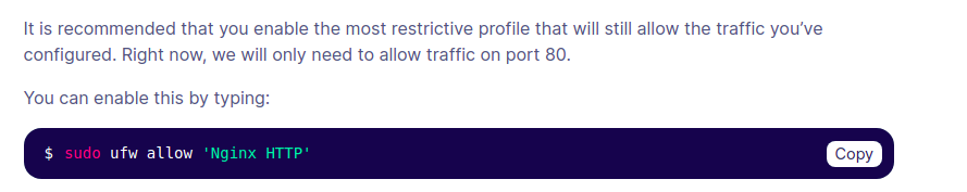 It is recommended that you enable the most restrictive profile that will still allow the traffic you’ve configured. Right now, we will only need to allow traffic on port 80. You can enable this by typing: