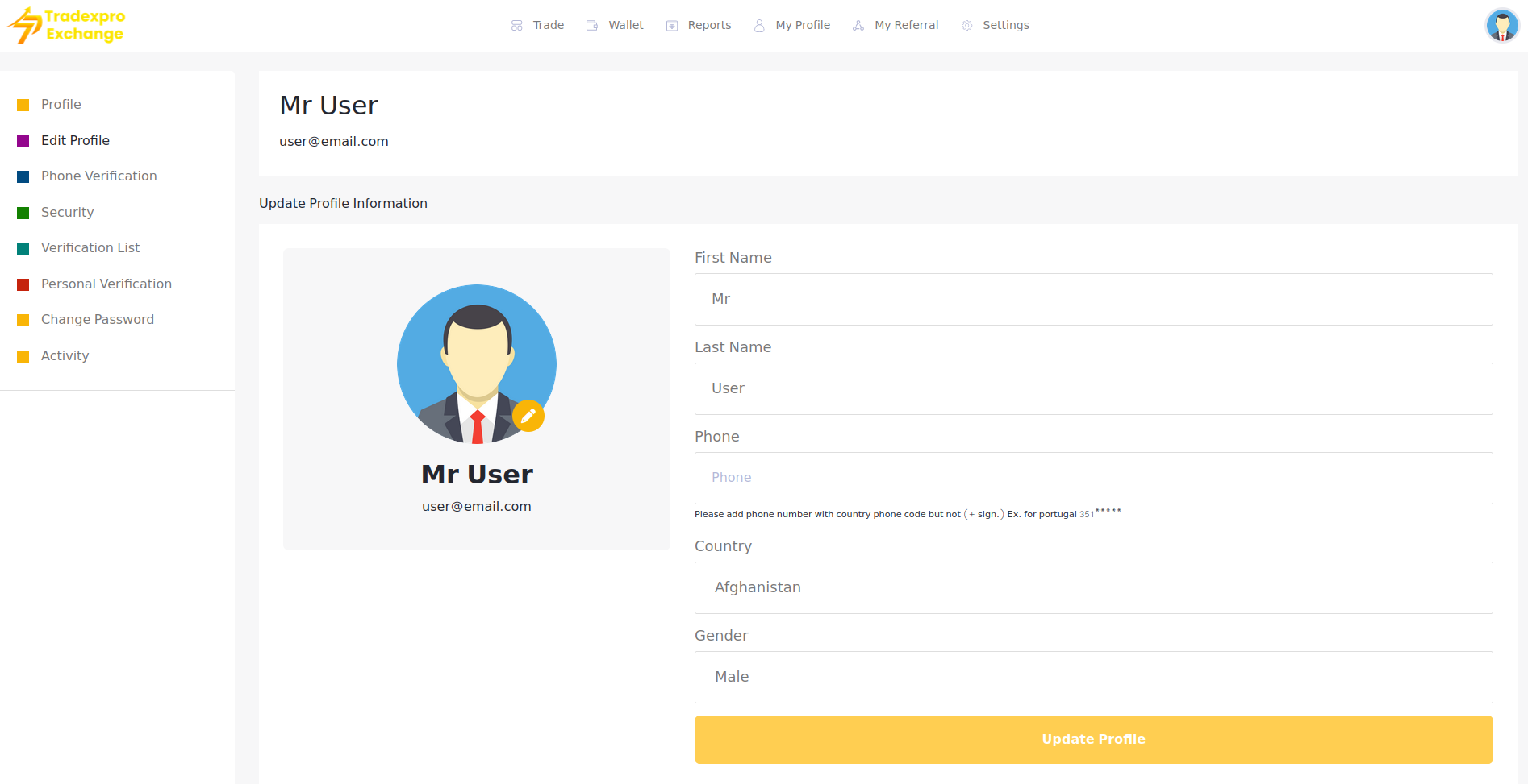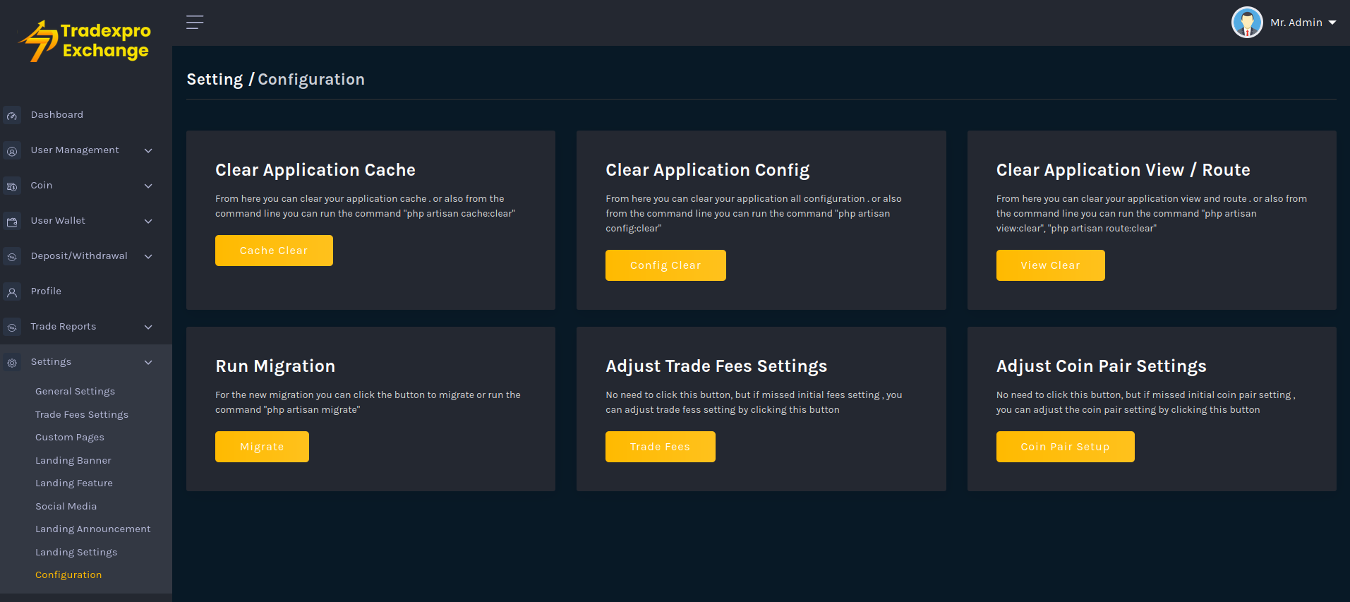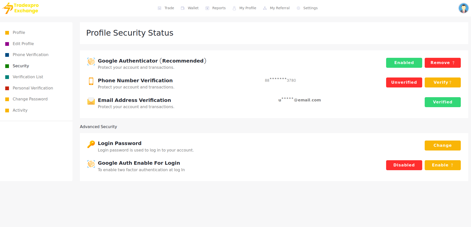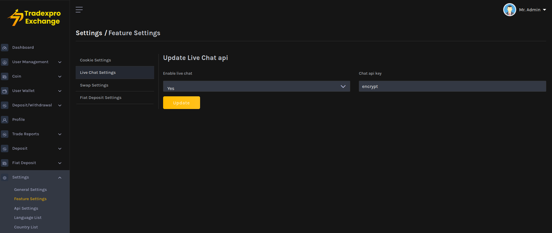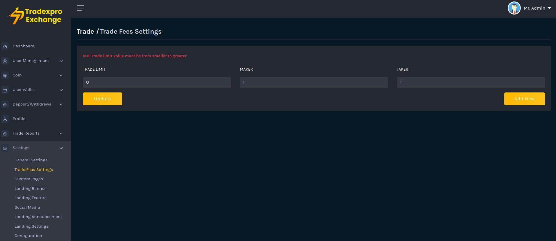 Tradexpro Exchange is a complete crypto coins exchange platform developed with Laravel and next js. It is the best choice to buy, sell or exchange any crypto coin that works via coin payment or bitcoin fork node. It will connect with a coin payment merchant account, or also connect with node. Our system is 100% secure and dynamic. It supports all cryptocurrency wallets including Coin Payment, Buy , Sell , Stop Limit, Deposit, Withdrawal, Referral system, and whatever you need. The most attractive feature of this platform is trading. In the trading system, you can place buy and sell orders according to your preferences of coin prices. Beside that, you can check your balance from wallet section. You can also check your buy-sell transaction status, deposit, withdrawal histories.