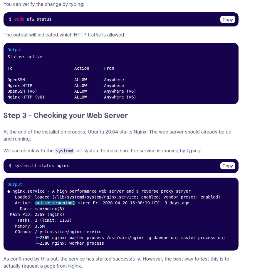 As confirmed by this out, the service has started successfully. However, the best way to test this is to actually request a page from Nginx. You can access the default Nginx landing page to confirm that the software is running properly by navigating to your server’s IP address.